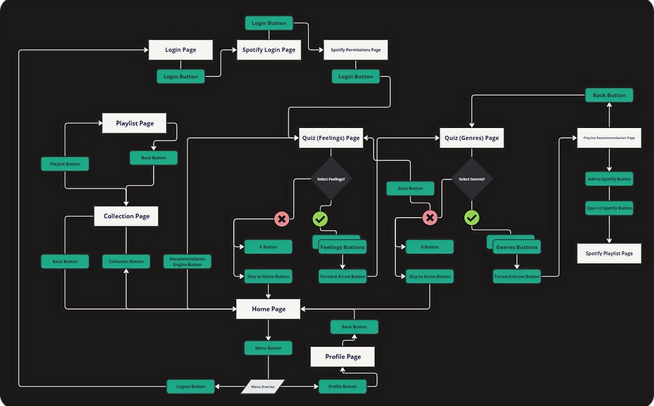 After some pruning, I settled on a flow that required the least amount of clicks and pages. In reality, you only have to make two sets of decisions to complete the main music recommendation user flow in TheraSonic.